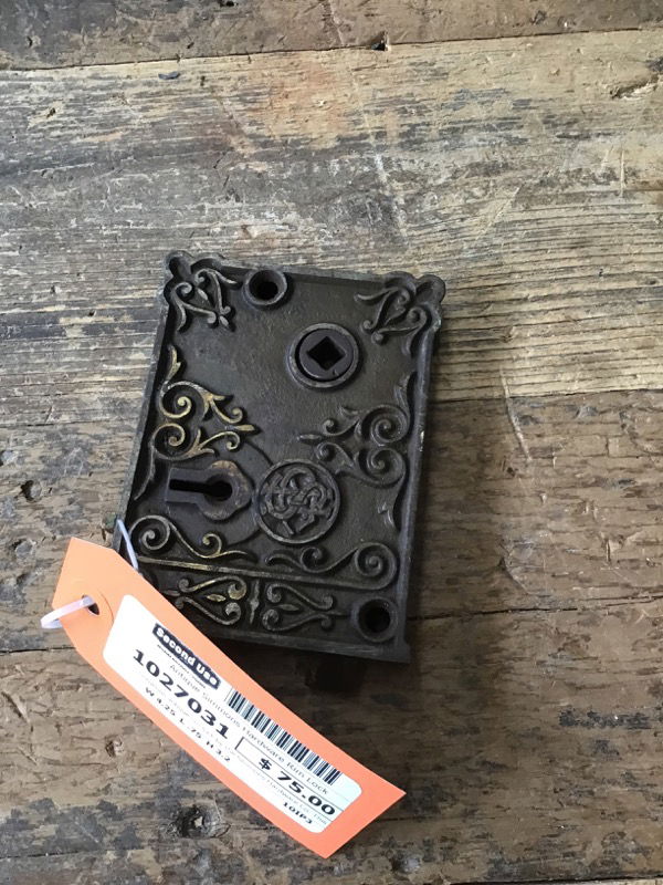 Gorgeous antique rim lock by the Simmons Hardware Co. This is constructed of cast iron and features elegant yet whimsical scroll detailing. A real beauty in excellent shape!