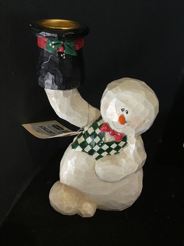 Adorable resin figurine from Midwest of Cannon falls featuring a snowman who will use his top hat to hold your candle. Thanks, snowman.