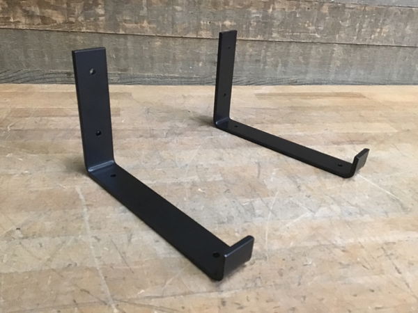 Sold as a pair. Locally fabricated by a family operation. Made for a 9" wide shelf board from bent 1/4" steel. Lipped front and painted black.