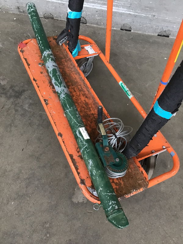 A big green metal post with a Shelby 5403 hand winch attached. Once used to hold up a tennis net, but who knows what the future holds for this one? Small flag pole? Handmade boat trailer?