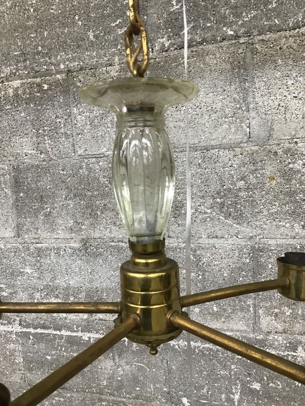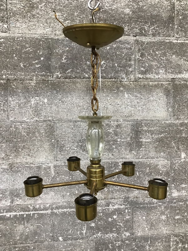 Simple brass chandelier with five arms.