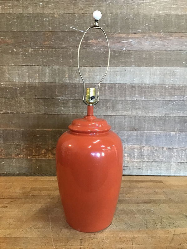 Burnt orange ceramic table lamp in good, used condition. Just needs a shade! Tested in house and worked.