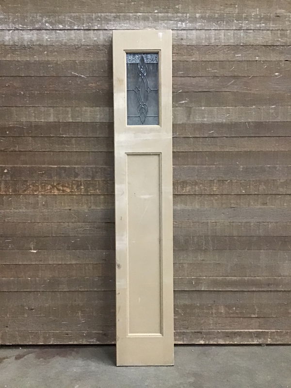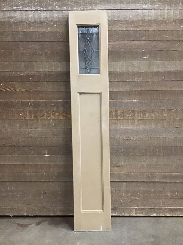 Fiberglass clad sidelite with a faux CVG wood texture and leaded glass thermopane lite. Does not appear to have been previously installed but does need a good wipe down.