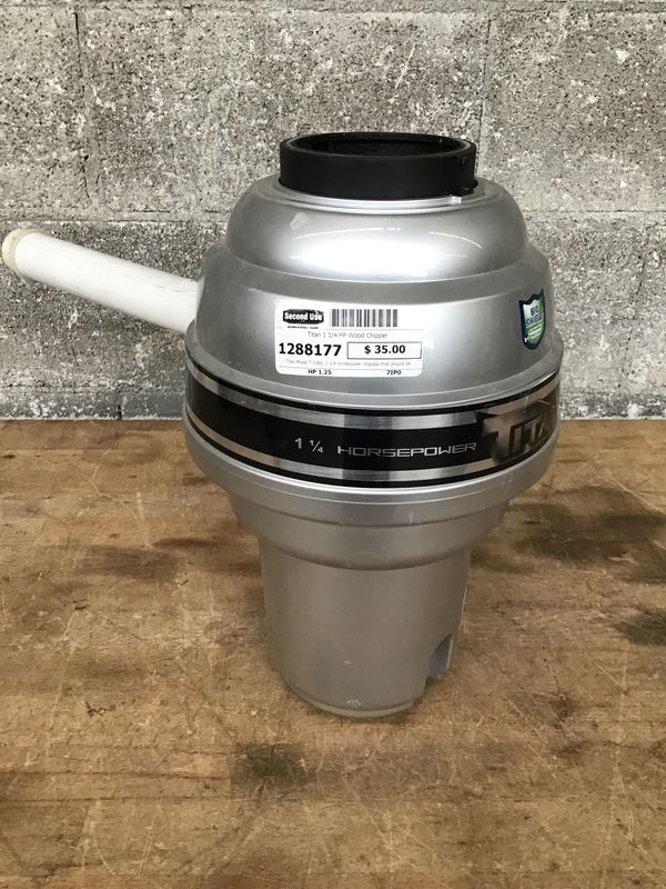 Titan Model T-1060, 1 1/4 Horsepower disposal that should be enough to do your Fargo wood chipper scene reenactment and sells for $148 online. This one will need its drain connection, but it seems to run fine when briefly tested in Receiving.