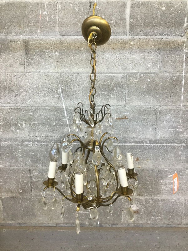 Brass ceiling mount chandelier with crystals galore! Candle style lights, one missing shade. Would make a great centerpiece. If you’d like to get this light fixture rewired here at Second Use, please check out our in-house Lighting Services.