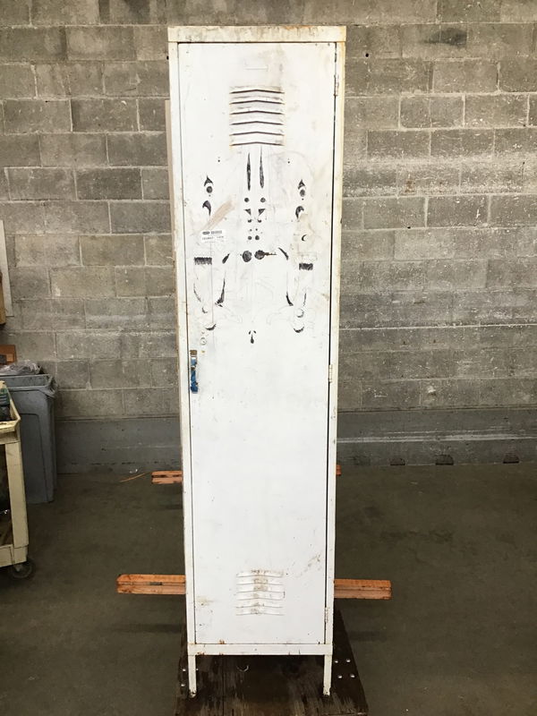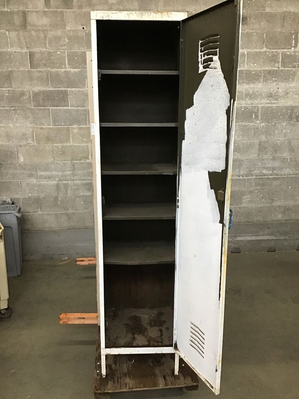 All steel shop cabinet that's very dirty and decorated. It has five fixed shelves inside and will keep your gear off the ground at the very least. It all works fine so it could be cleaned up!