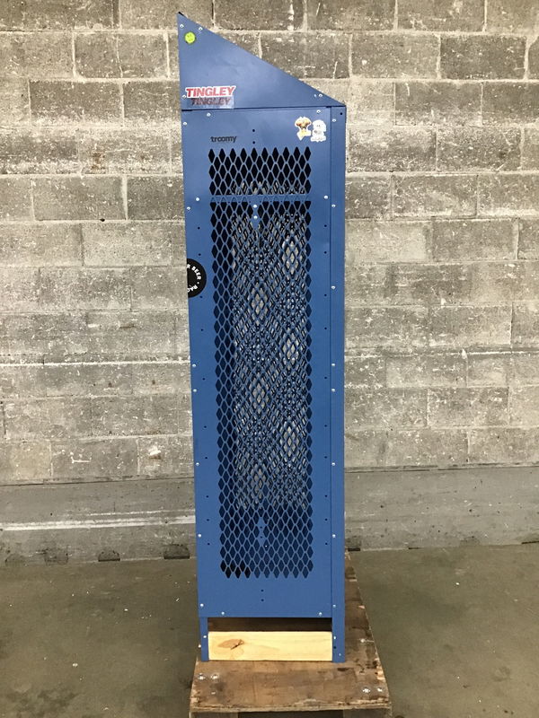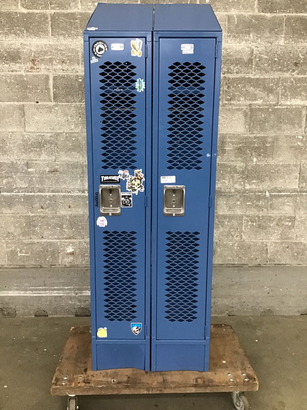 Modern, well-made double bank of lockers with perforated steel panels, shelves up top, various hooks and spaces for padlocks on the doors. Has a slanted top to prevent those sneaky kiddos from putting things on top of it.