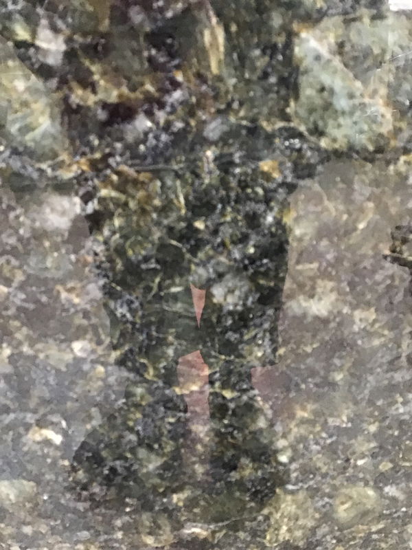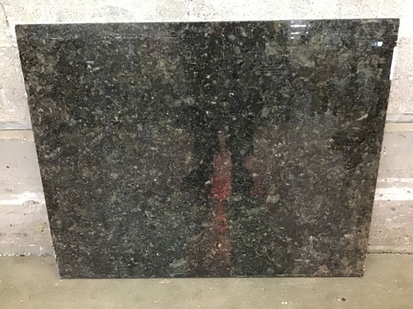Darker colored chunk of granite countertop with some silvery and light brown speckles. Has two finished sides.