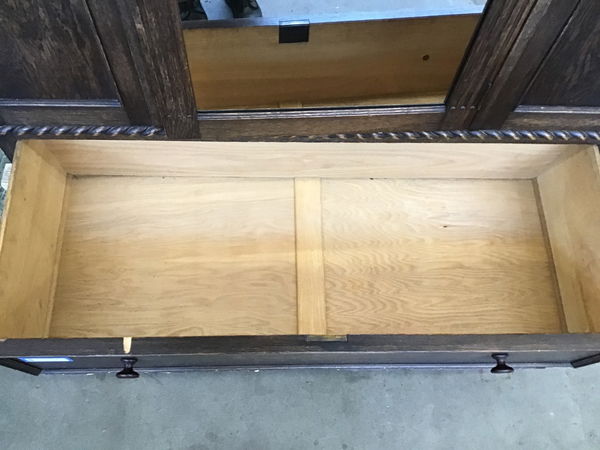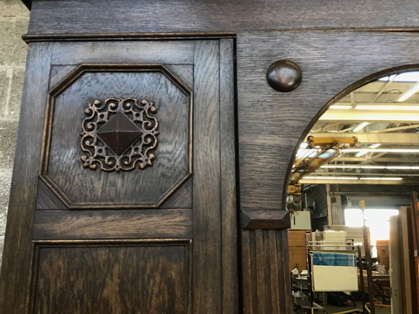 Stately and handsome vintage Oak armoire with full length mirror on the door and plenty of room for hanging garments on the interior and storing items in the drawer below. This unit is the ultimate all-in-one closet for a small space with some lovely aesthetic details to boot. The two major issues with it include a knob foot that has separated but could easily be glued back on and the pull hardware (that also operated the latch) is broken-that will need a little more specialized attention. The top crown piece can be removed for easy transport. Price reflects project status.