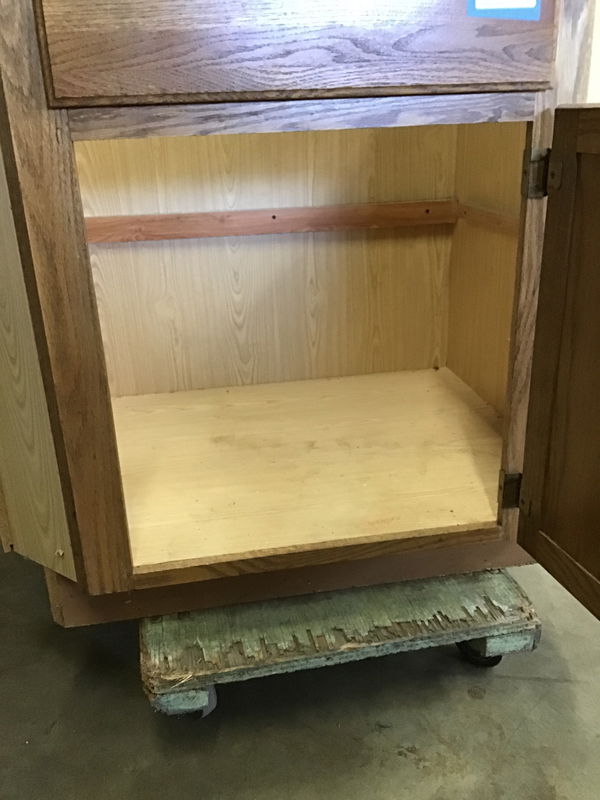 Oak kitchen base cabinet that has a faux drawer and one door. Looks like it may have once had a fixed shelf, though one is not included. This cab is deeper than standard.