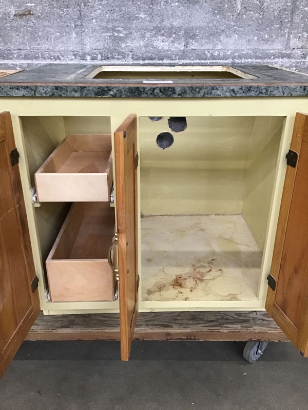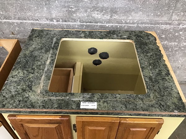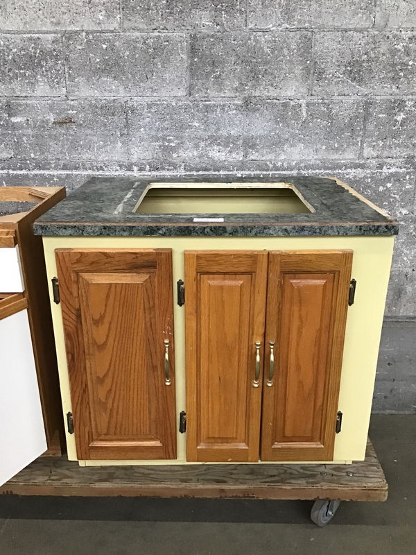 A funky li'l vanity cabinet with three oak doors. One of the doors opens to reveal the two hidden drawers inside. The box of the cabinet has been painted a yellow tone, and it sports a mid countertop with some green laminate that's seen better days. Would be great for an artist's studio, a workshop, or a basement restroom! Price reflects condition.