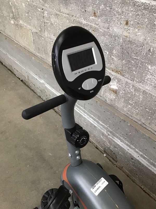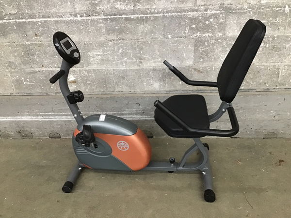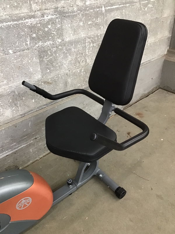 A stationary recumbent exercise bike by Marcy (model no. ME-709) that looks to be in good functional shape, with adjustable seating and easy disassembly for storage. Retails new for about $250.