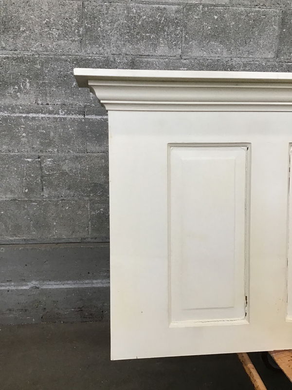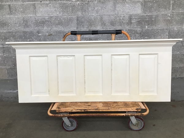 DIY'd headboard made of a vintage five-panel door and moulding, tres farmhouse chic! Structurally solid with a wall mounting bracket on the back, ready to adorn your Queen or King size bed!