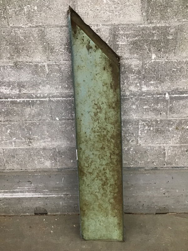Piece of copper roofing that was mitered on one end. It would make a great directional arrow. Weathered on one side, relatively shiny copper on the other. Length listed is from end to end.