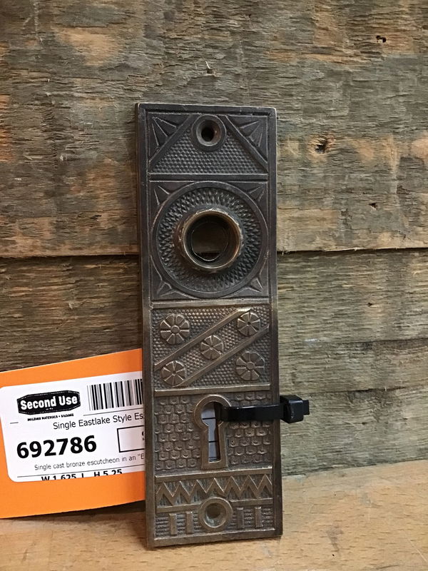 Single cast bronze escutcheon in an "Eastlake" style, with distinct individual patterns in different sections. Overall in alright condition and a clean look, but the top is slightly bent forward and may need adjusting so the price reflects.