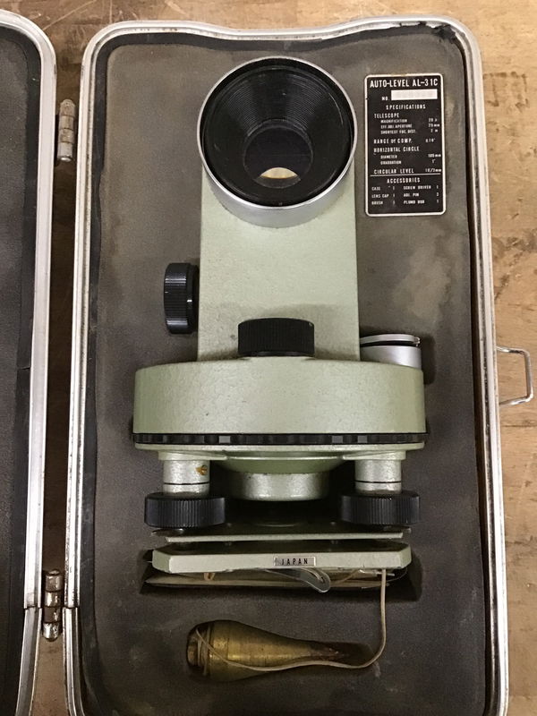 Here we have a Auto Level by GeoTec, made in japan, comes in a orange hard case, model AL-31C, Serial No. 426329. Includes some maintenance hardware and a plumbob.