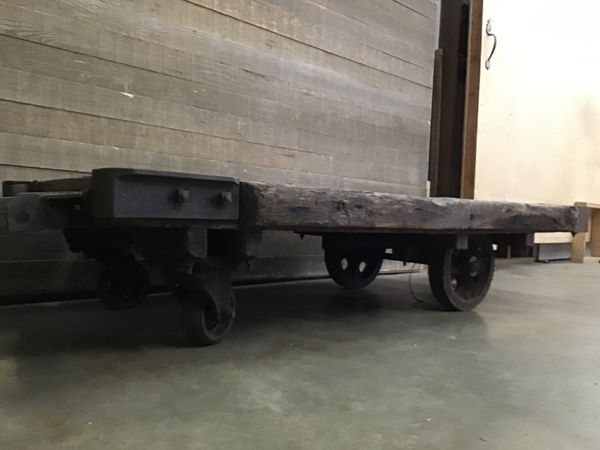 This cart has so much character. Weathered wood frame with cast iron wheels/casters. Sits level and great size for a rustic coffee table project.