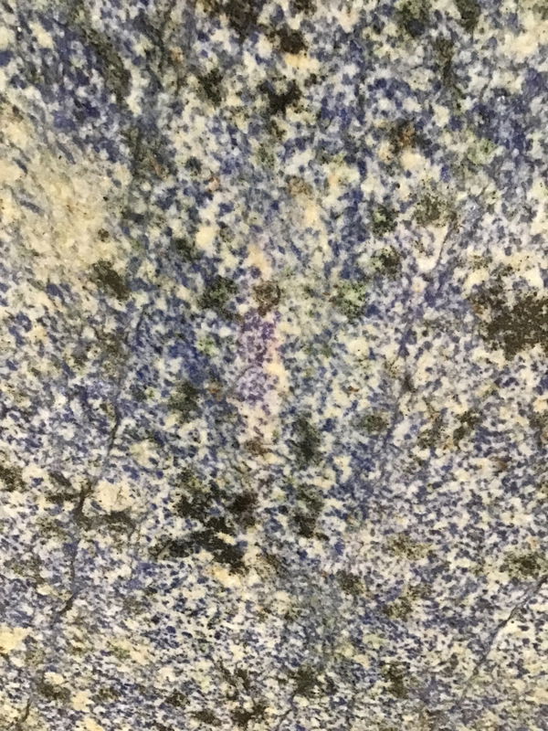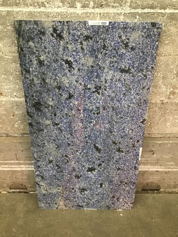 Simply gorgeous! Unusual and distinctive blue granite from Bahia, Brazil. This rectangle is polished on one side, but edges are unfinished. Has some dollops of mortar and adhesive on back side.