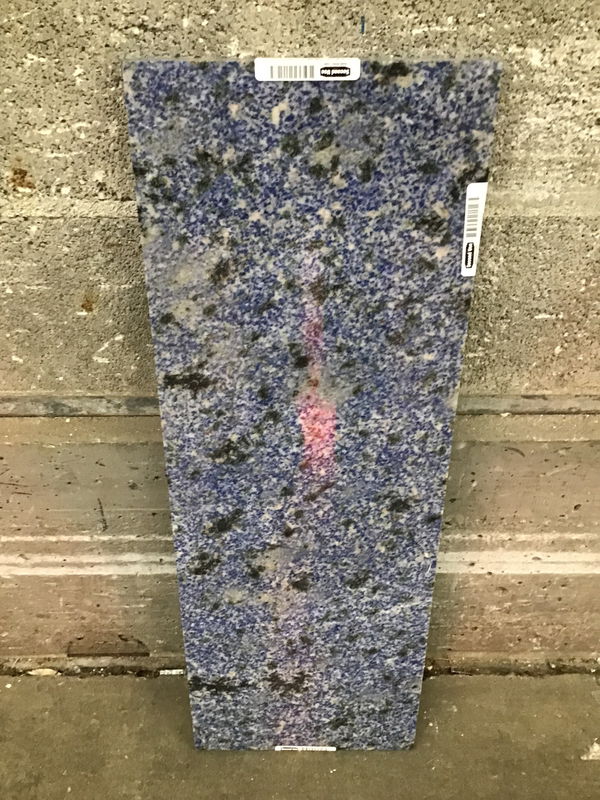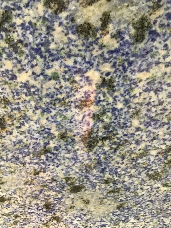 Simply gorgeous! Unusual and distinctive blue granite from Bahia, Brazil. This rectangle is polished on one side, but edges are unfinished. Has some dollops of mortar and adhesive on back side.