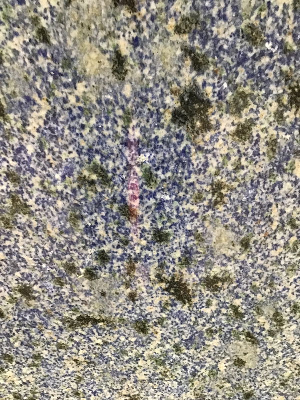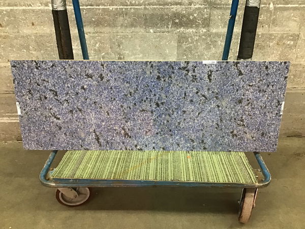 Simply gorgeous! Unusual and distinctive blue granite from Bahia, Brazil. This rectangle is polished on one side, but edges are unfinished. Has some dollops of mortar and adhesive on back side.