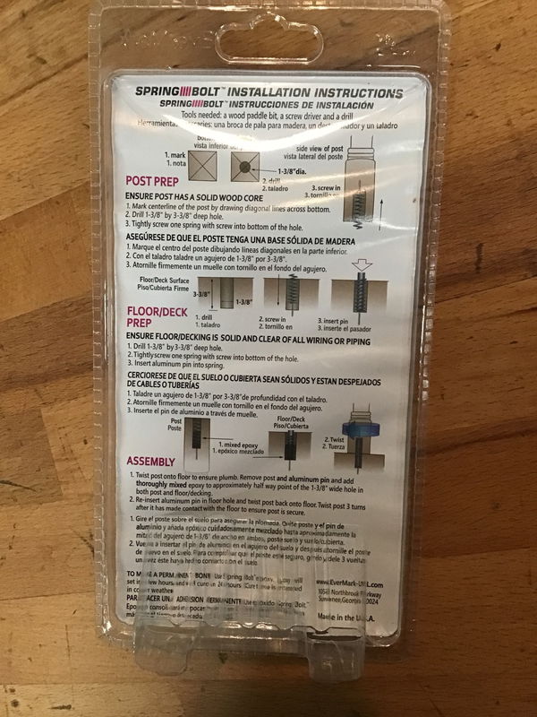 New in package, the revolutionary Spring Bolt! that connects posts to floor or decking. Sells new at box stores for about $22, see here for specs!