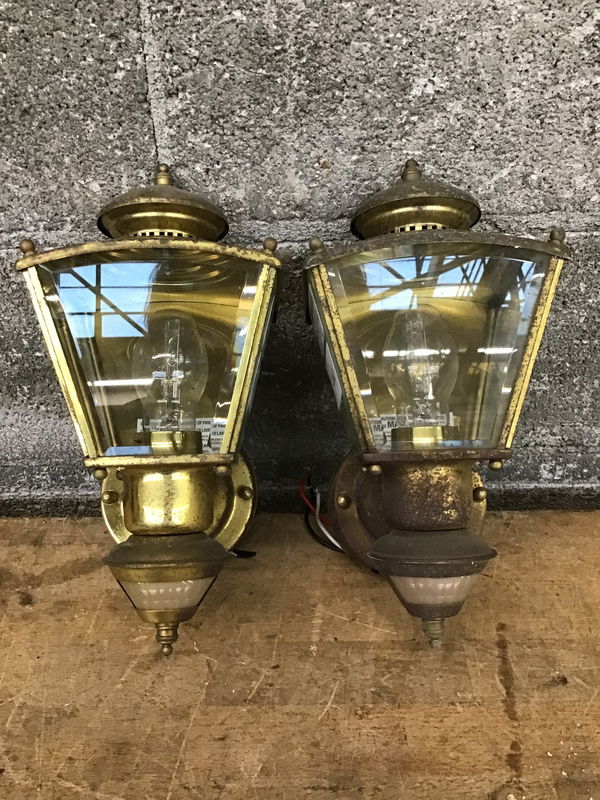 Pair of classy exterior sconces sporting brass construction and a weathered patina. These have motion detectors as well as a timer function.
