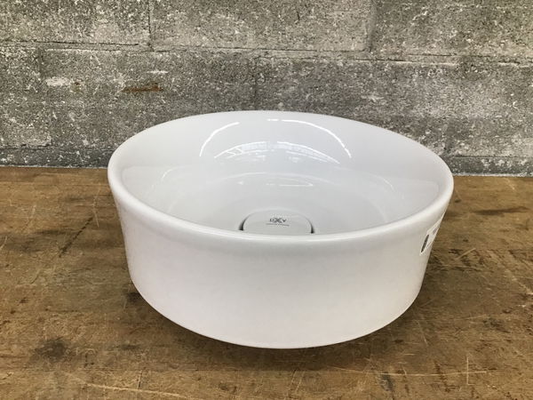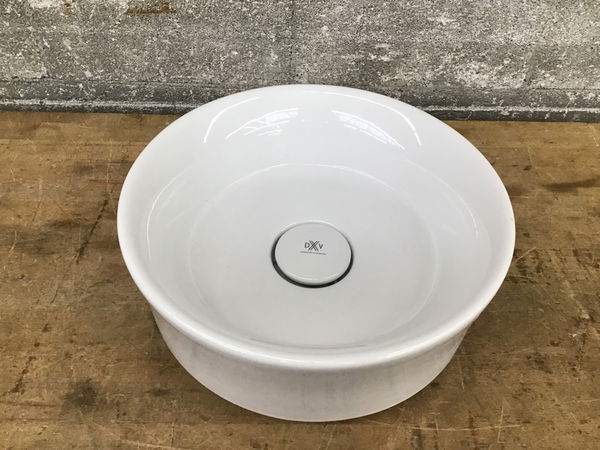 DXV "Pop" round fireclay vessel sink with a sleek look and a ceramic drain trap. Retails new for $460+. Specs here.