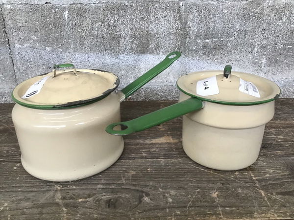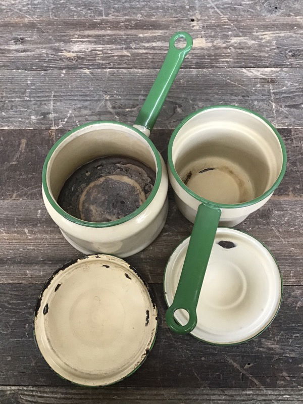 Four piece (two lids, two vessels), vintage, cream and green enameled steel double boiler set up. Has a fair amount of wear, but still nice looking.