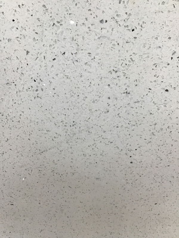 This is a manmade composite granite in the style "Ice Stone". Features mostly white coloring with speckles of silvery and clear crystals. Has two finished edges.