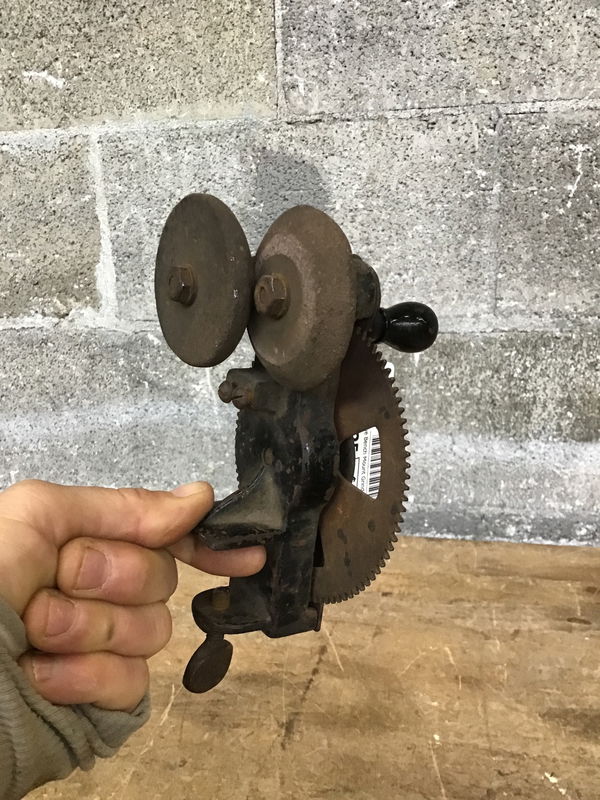 Antique Bench Mount Grinder that has two grinding wheels, I'm assuming for sharpening. This grinder is crank operated and operates fine enough but you could get it to be smoother after some cleanup and lubrication.