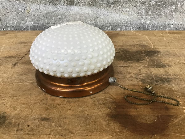 Fun, vintage ceiling light fixture with copper fitter and dimpled opaque shade. Will likely need to be rewired, check out our lighting services for help!