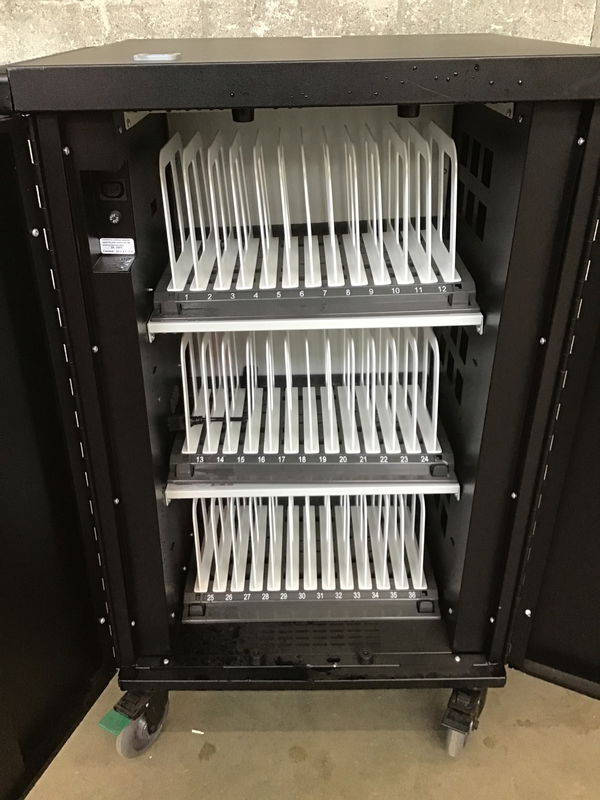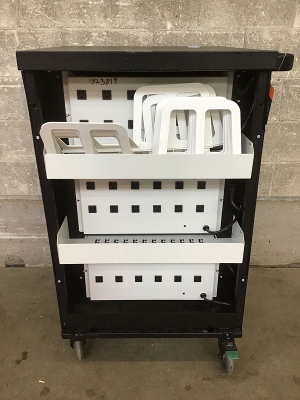 This is a mobile charging cart made by Bretford. This cart is capable of charging 36 devices at once, enabled by it's onboard power distributors. Has lockable handle. These go for around $2.5K to upwards of $3K brand new.