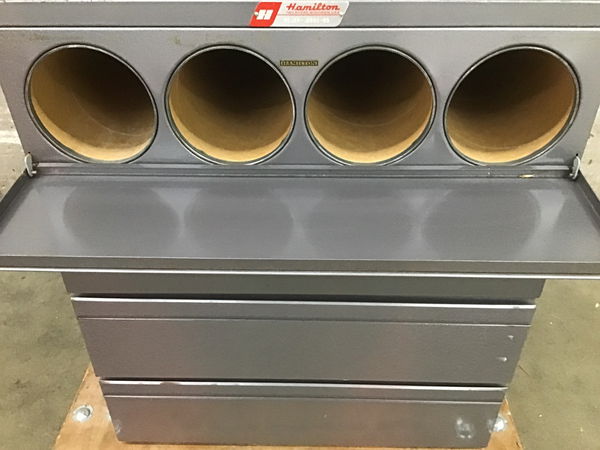 This vintage steel modular storage set is out of this world fun! Made by Hamilton probably sometime 1950-1970s, each unit of this set lifts away for convertible arrangement (includes 2 extra tops). We're told this was meant for rolled storage of maps or architectural plans, and each unit has four 4" diameter tubes inside. Maybe you're a map collector, or we can imagine this used as fabric storage, classroom storage, or even a new life as a fun cat hidey-hole! :3