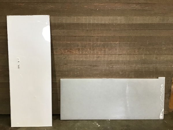 1.25"-thick frosty glass countertop, looks like it's made up of a bunch of wavy layers of glass with some interesting shapes in the surface. This one comes with an LED light panel that can be installed beneath the countertop to light it up! Price reflects some chips at the corners.