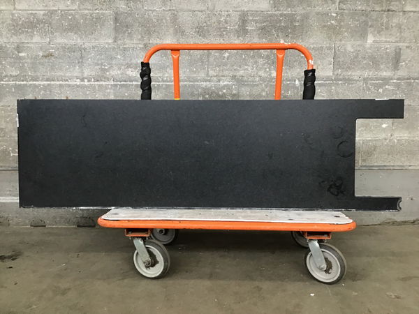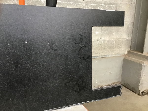 Attractive "dark black pepper" (by description, not the factory's) man made vanity depth countertop with finished front and right edges. Length listed is to the start of the sink cutout. Length for transport is 79 3/8".