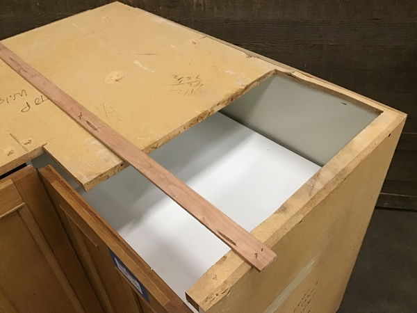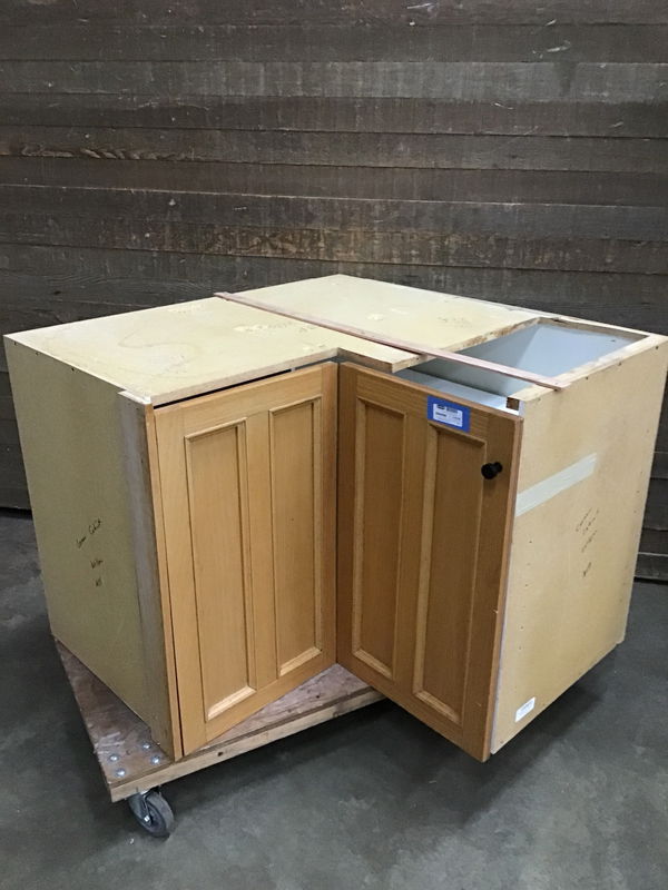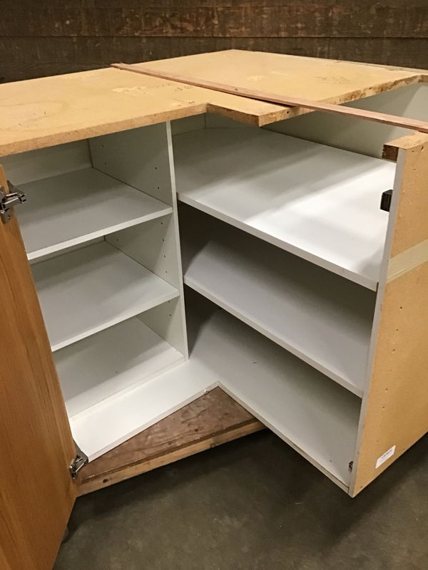 Corner kitchen base cabinet with a light stained Oak face and particle board box. Has one bi-fold door with four recessed panels and a matte black pull. Comes with 4 adjustable shelves. Needs some support for the top, but should secure up nice with a countertop installed. Needs a toe kick/base. Price reflects the defects.
