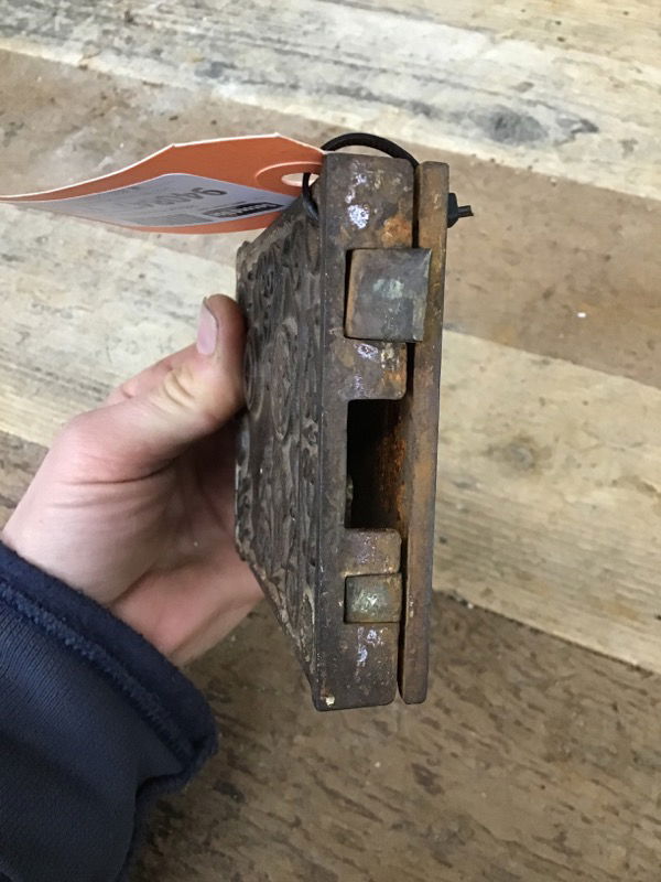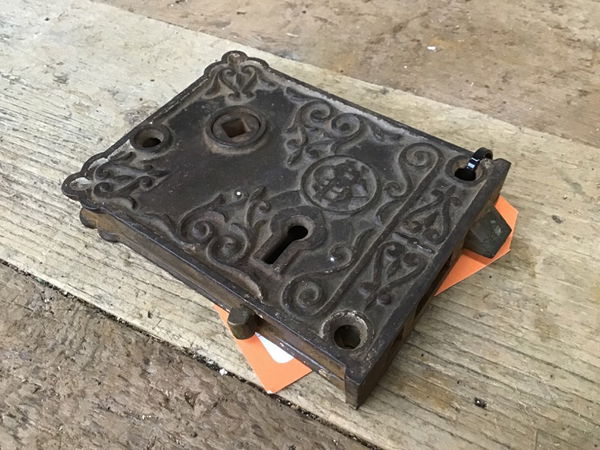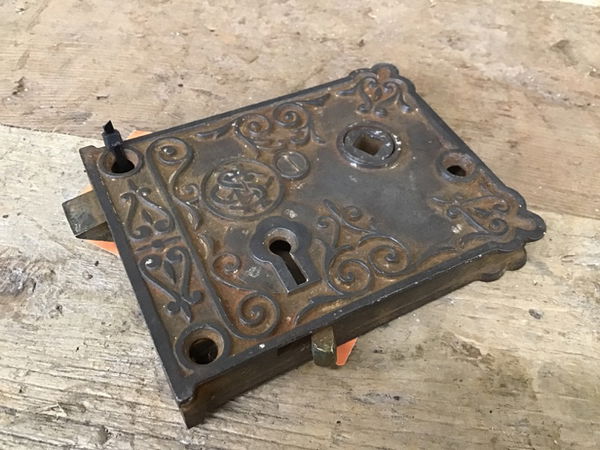 Circa. 1903 antique Simmons Hardware Co, steel "Royal" horizontal rim lock/mortise box. This beautiful early 20th/late-19th century ornate hardware piece is wonderfully crafted with character, from the shape of the structure to the emblem motif & foliate details. Has the original Etruscan bronze finish to steel with some oxidization forming.