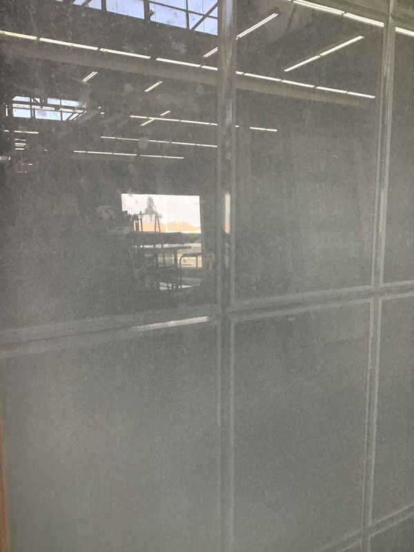 A full lite interior door with a nicely weathered slate blue painted finish. The full lite glass has a unique faux beveled division going on and overall looks like a great door. This would make a good bathroom or pantry door.