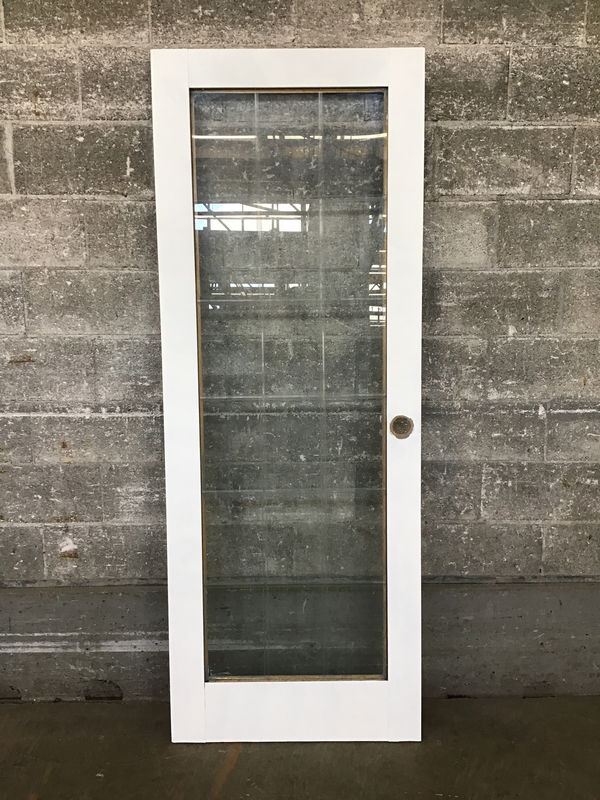 A full lite interior door with a nicely weathered white painted finish. The full lite glass features a unique faux beveled division, on one side an ogee trim will need to be installed and the price reflects.