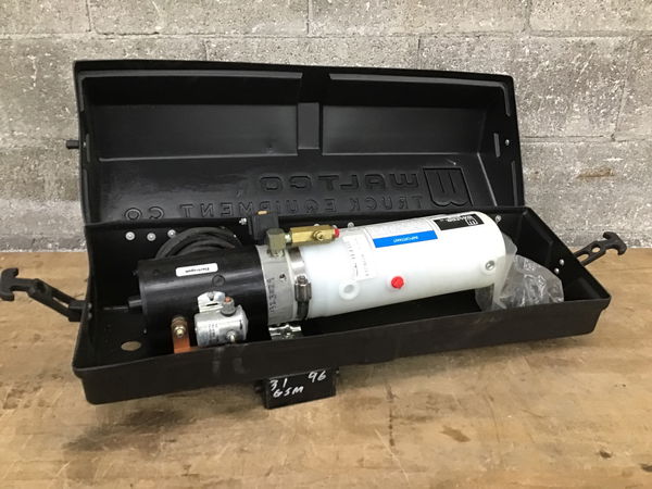 A Waltco model 70400000 hydraulic power pack for liftgates with an attached poly reservoir and a control switch for a liftgate. This unit is compatible with Waltco C-Series, E-Series, and F-Series Tuck-A-Way liftgates. Sold untested. Currently retails for over $900.