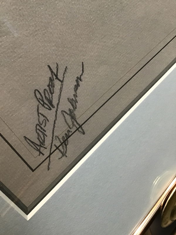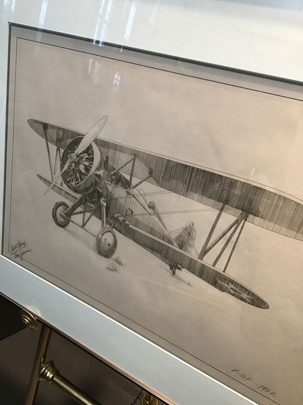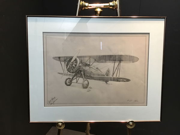 Not too often do we see "artist proof" prints in our store so these are something special. Artist Proof prints are specifically made as a copy for the artist themselves so we are fortunate to have this. This is a print of a Biplane, sitting and waiting to take off. Signed in pencil in the bottom left corner "Artist Proof/ Ken Johnson" with the model number of the plane P-12F and the year 1932 on the bottom left corner. Not only is it a lovely print it also sits in a gorgeous metal frame with a shiny bronze hue.