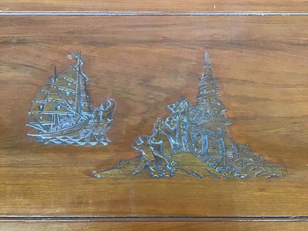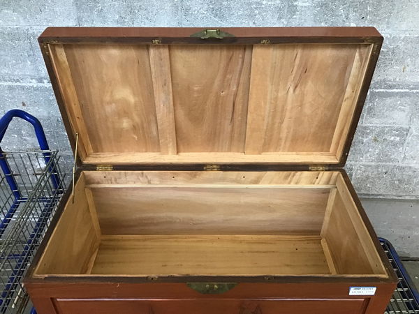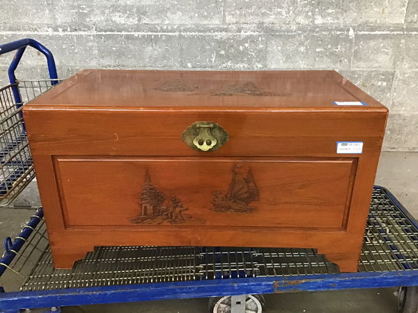 Well-maintained warmly stained solid wood truck with carved designs featuring various Asian inspired landscape scenes on four of the five sides of the trunk. Doesn't have any lingering odors and only minimal, light cosmetic wear.