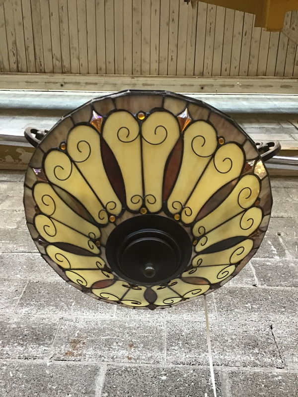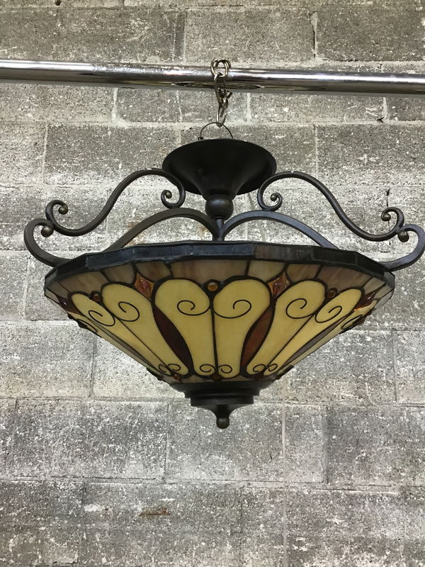 Tiffany-style semiflush light from Quoizel with a warm color scheme and some 3D elements to make this guy really pop. Tones of red, purple, orange, and yellow throughout. This style has been discontinued, but similar lights retail now for $300-400.