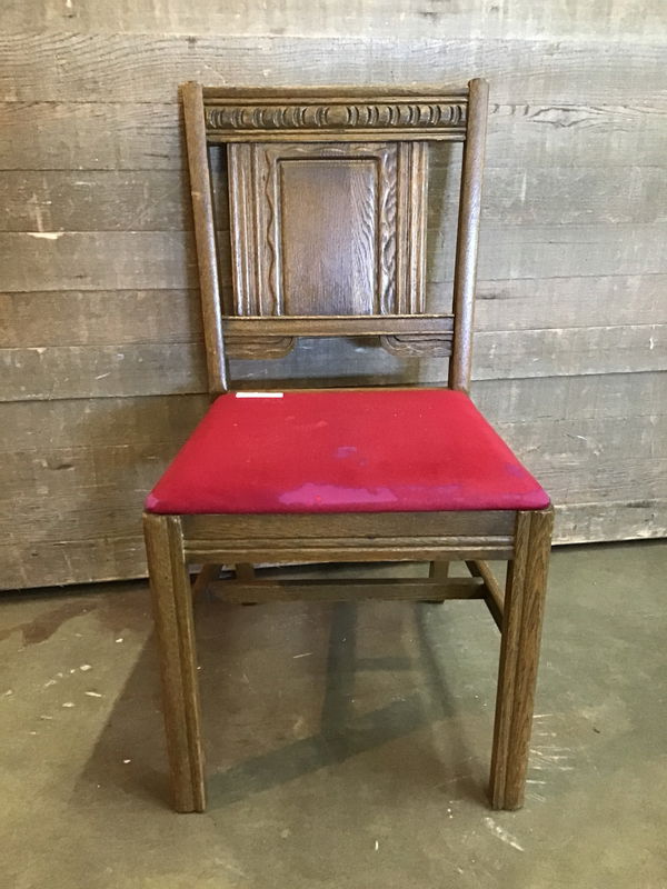 Snazzy little dining chair with an engraved wooden frame and red velvet cushioning on the seat. The cushion is a little worn but overall it's still in really good shape!