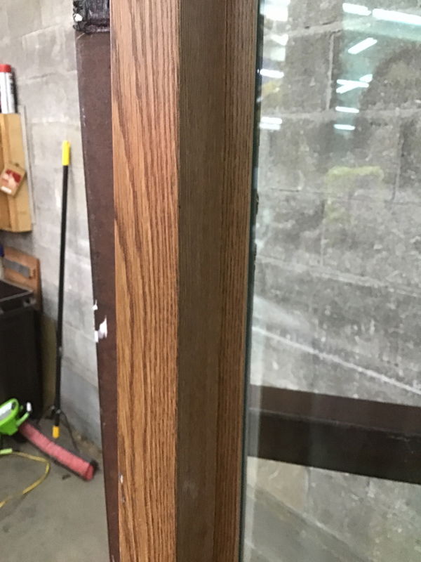 Large unique fixed vinyl window in great condition. The exterior is brown and the interior is... faux oak laminate. Yep, a first for me also. It's so well done though! Reminds me of a 1980's end table, but a window. I can't find an age stamp but I'd be surprised if it's older than 20 years. Photo may be representational.