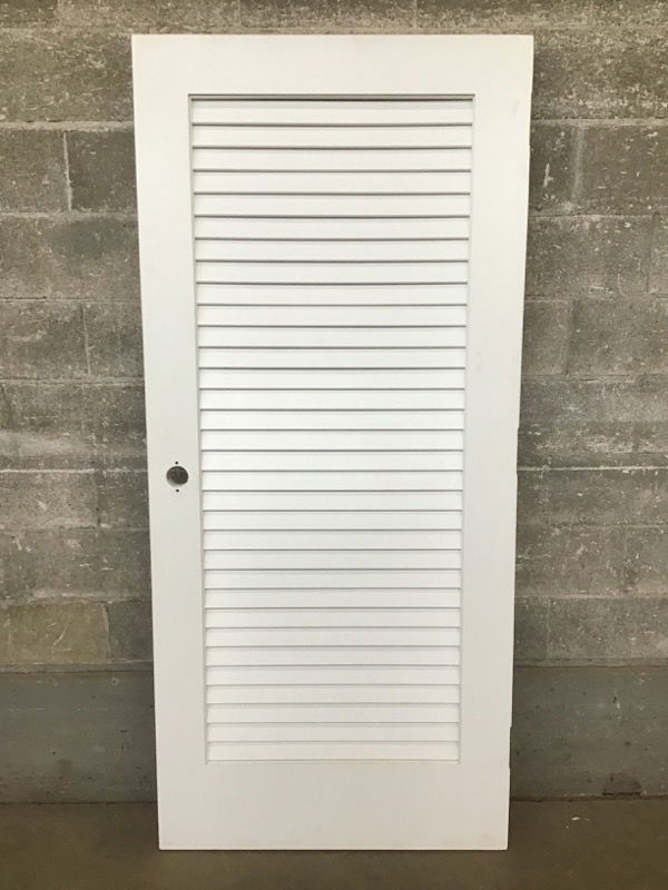 This extra-large louvered interior door features a sturdy frame with exterior thickness and a fresh coat of white paint. If you were looking for a classic-looking, heavy closet door this would be ideal. Never installed, but some light wear from transportation to our store.