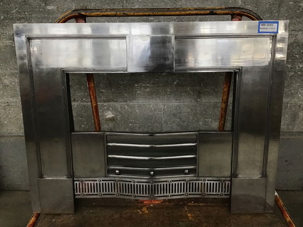 Absolutely stunning polished steel fireplace surround with a bit of a Deco-meets-Brutalist vibe. Striking lines and some serious heft make this a quality statement piece that you'll be enjoying for many years to come. There's a bit of oxidation on the grill but nothing that can't be managed with a little steel wool and time. The rough opening measures 29"W x 19-1/8"H.