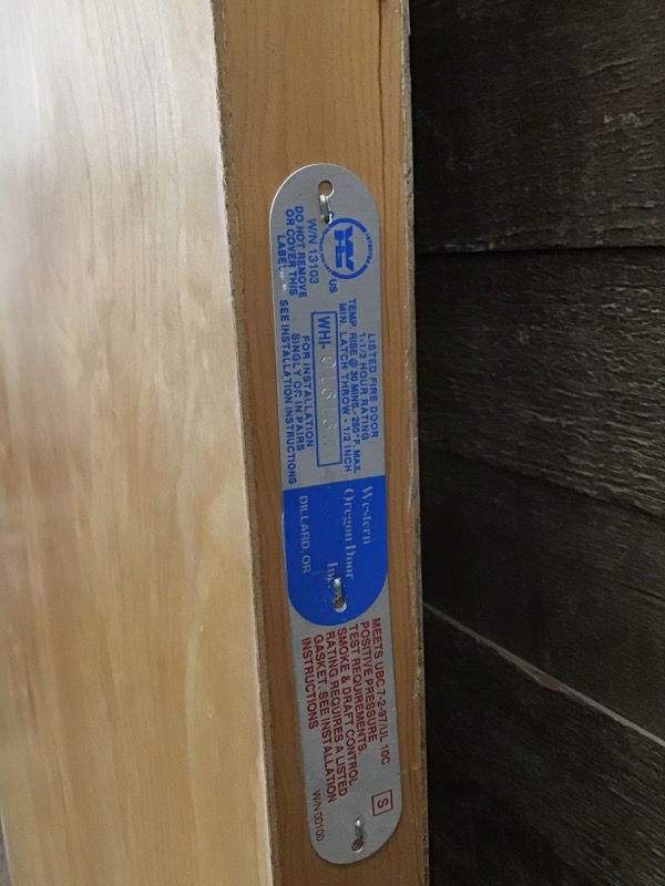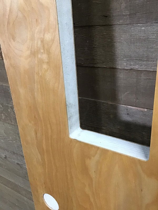 Heavy wood veneer fire door with 6x27" cutout for window will need glass installed. Label says it has a 1.5 hour fire rating. Made by Western Oregon Door. Has some small blemishes but is in overall good condition. Photo may be representational.