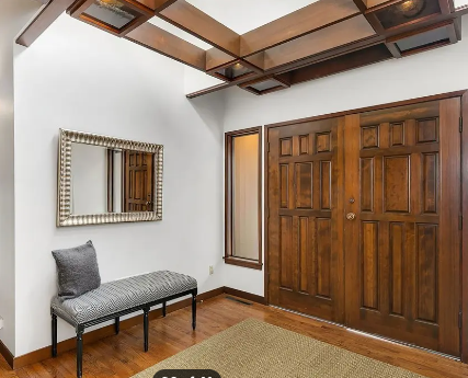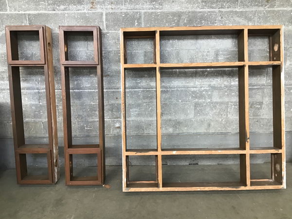 This custom built grid was originally suspended from the ceiling of an entryway with lighting behind each of the eight smokey glass panels. It's constructed of lusciously stained fir and comes in three pieces so you can mess around with the orientation to fit your space. Hang it from your ceiling, adorn your wall with it, or build it into a sick room divider. Tons of repurposing potential with this unique piece! The largest piece measures 65-7/8" x 66", the two smaller pieces measure 66" x 16". Each glass panel measures 13" square. Thickness = Height.