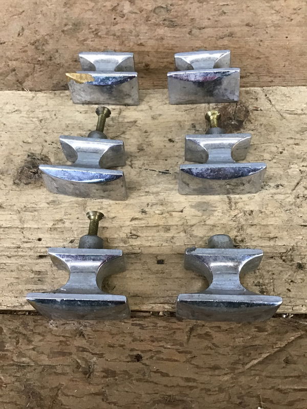 Set of six attractive, chrome finished MCM style knobs, these have a heavy feel, they bear spots of tarnish on various knobs.